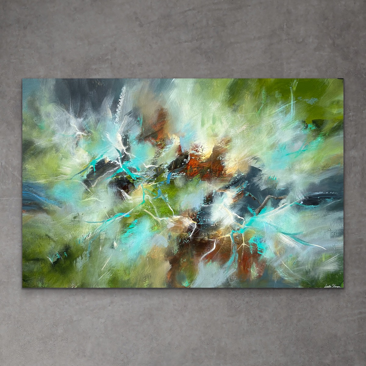 I den abstrakte serie møder du det energiske og spontane univers. Den rette ”male-feeling” udfolder sig, når jeg lader penslerne danse frejligt hen over lærredet. Kontrollen er sluppet og nu handler det om at komponere det univers, som gør nysgerrig og inviterer til ”fantasi-rejser” og personlig indlevelse.