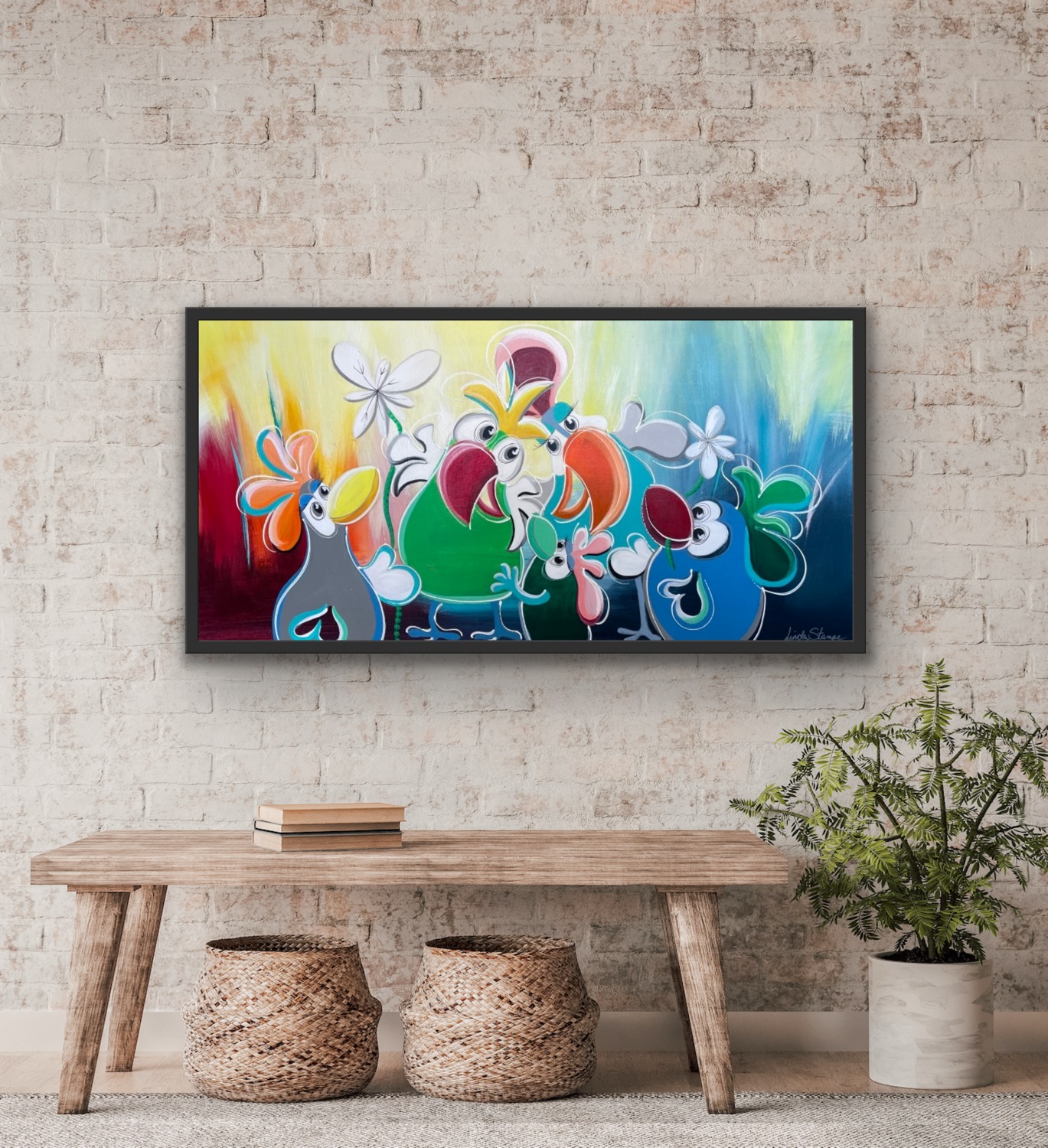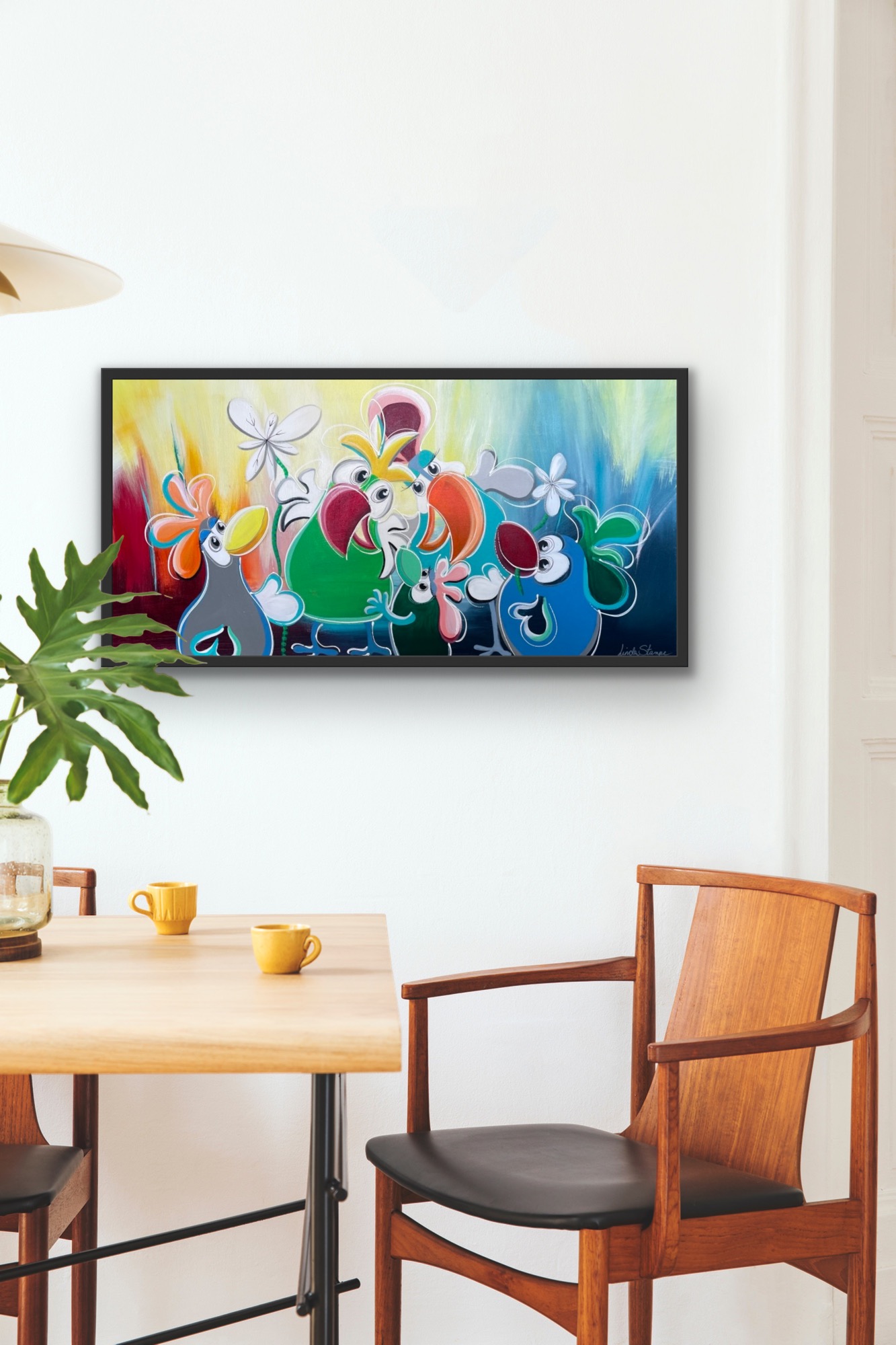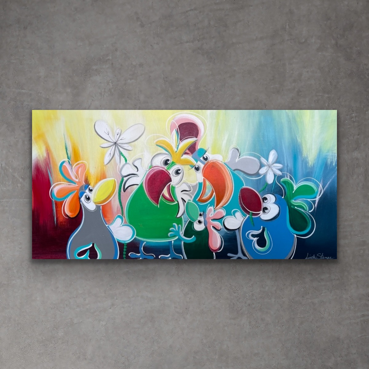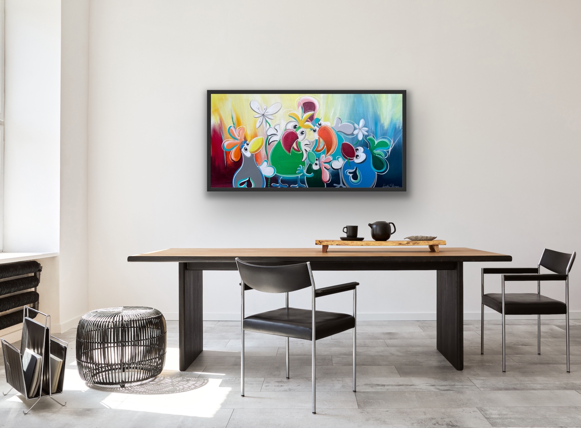 “Birds-serien” er kendetegnet ved en livs- og farveglad stil. Her møder du de kærlige og humoristiske fugle, der symboliserer frihed.