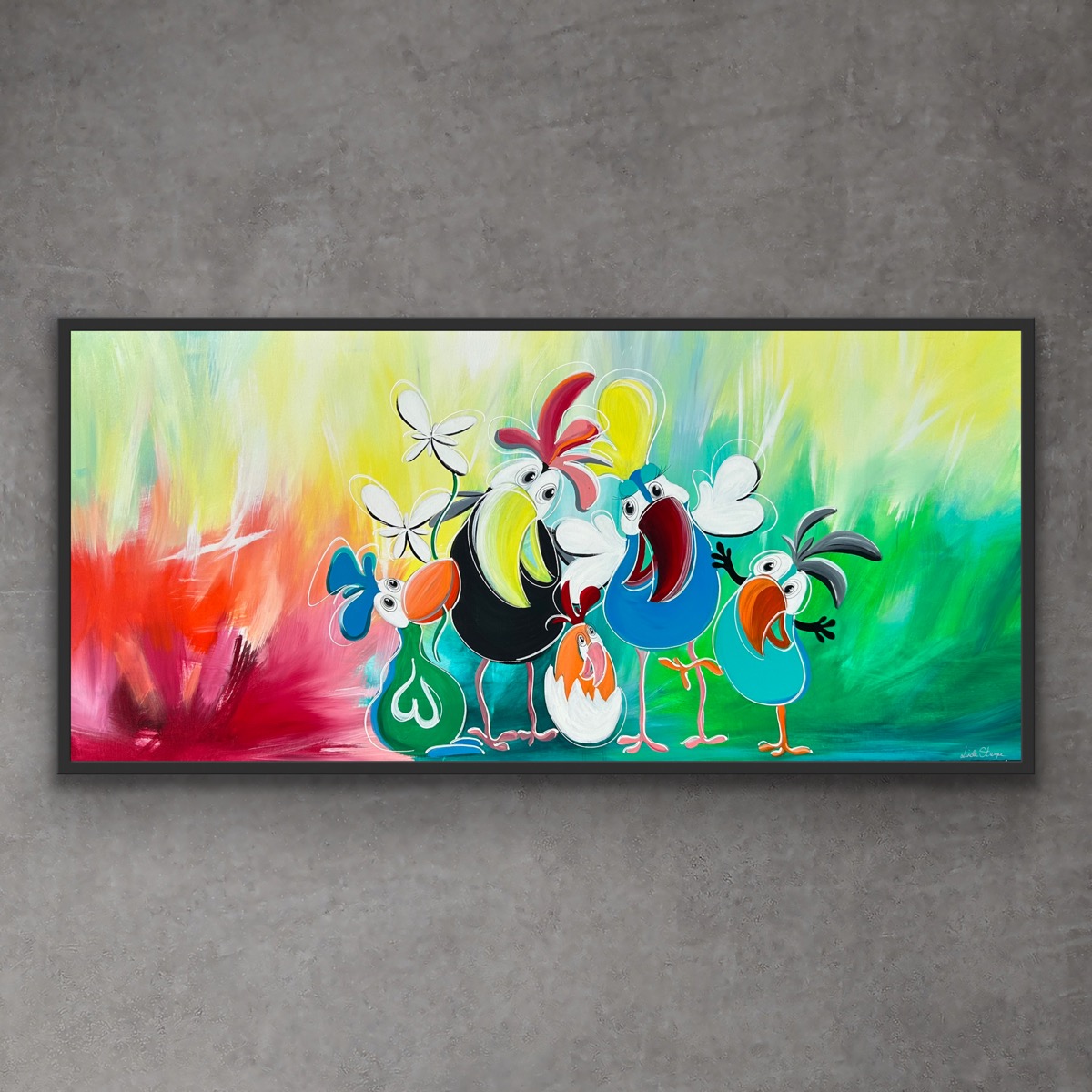 “Birds-serien” er kendetegnet ved en livs- og farveglad stil. Her møder du de kærlige og humoristiske fugle, der symboliserer frihed.
