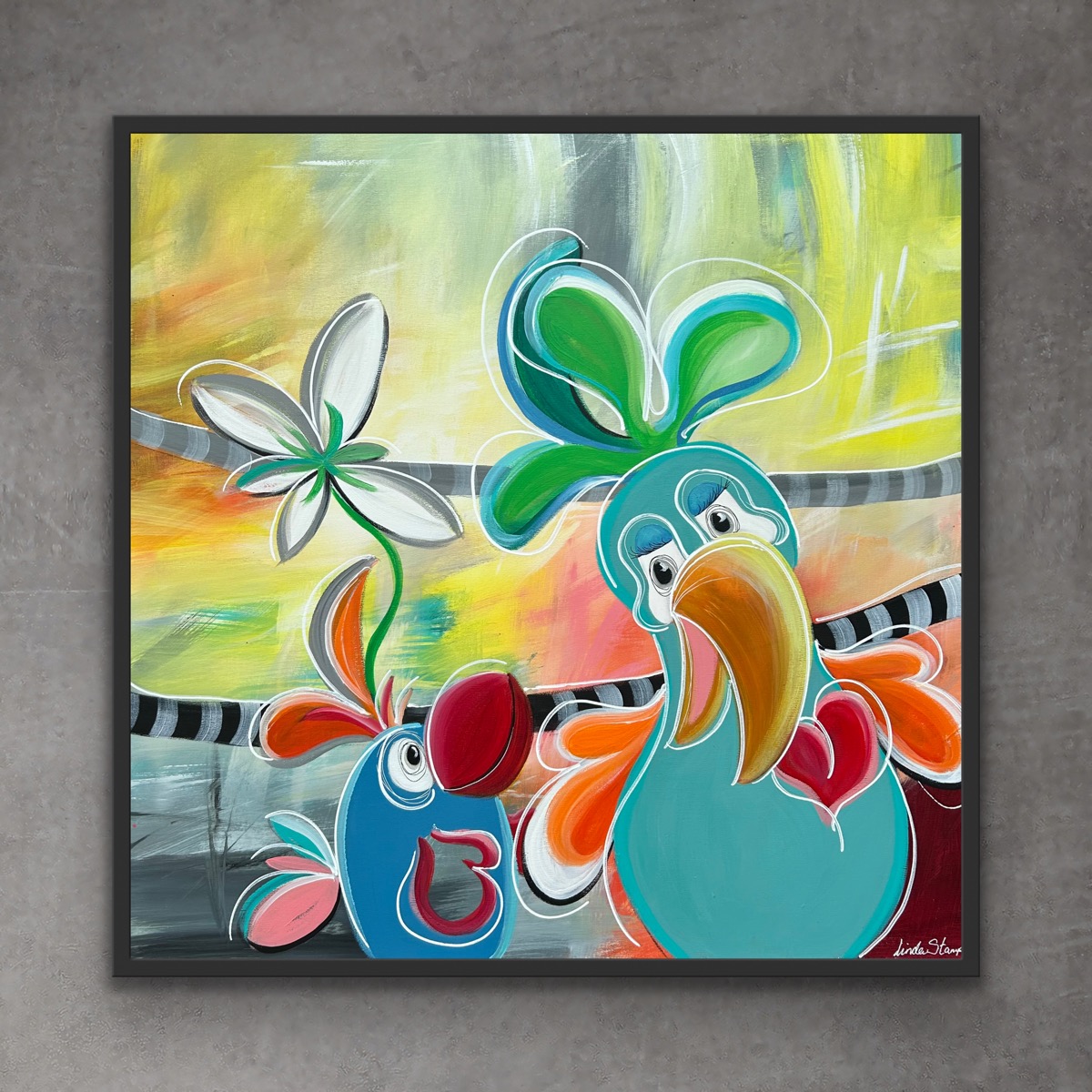 “Birds-serien” er kendetegnet ved en livs- og farveglad stil. Her møder du de kærlige og humoristiske fugle, der symboliserer frihed.