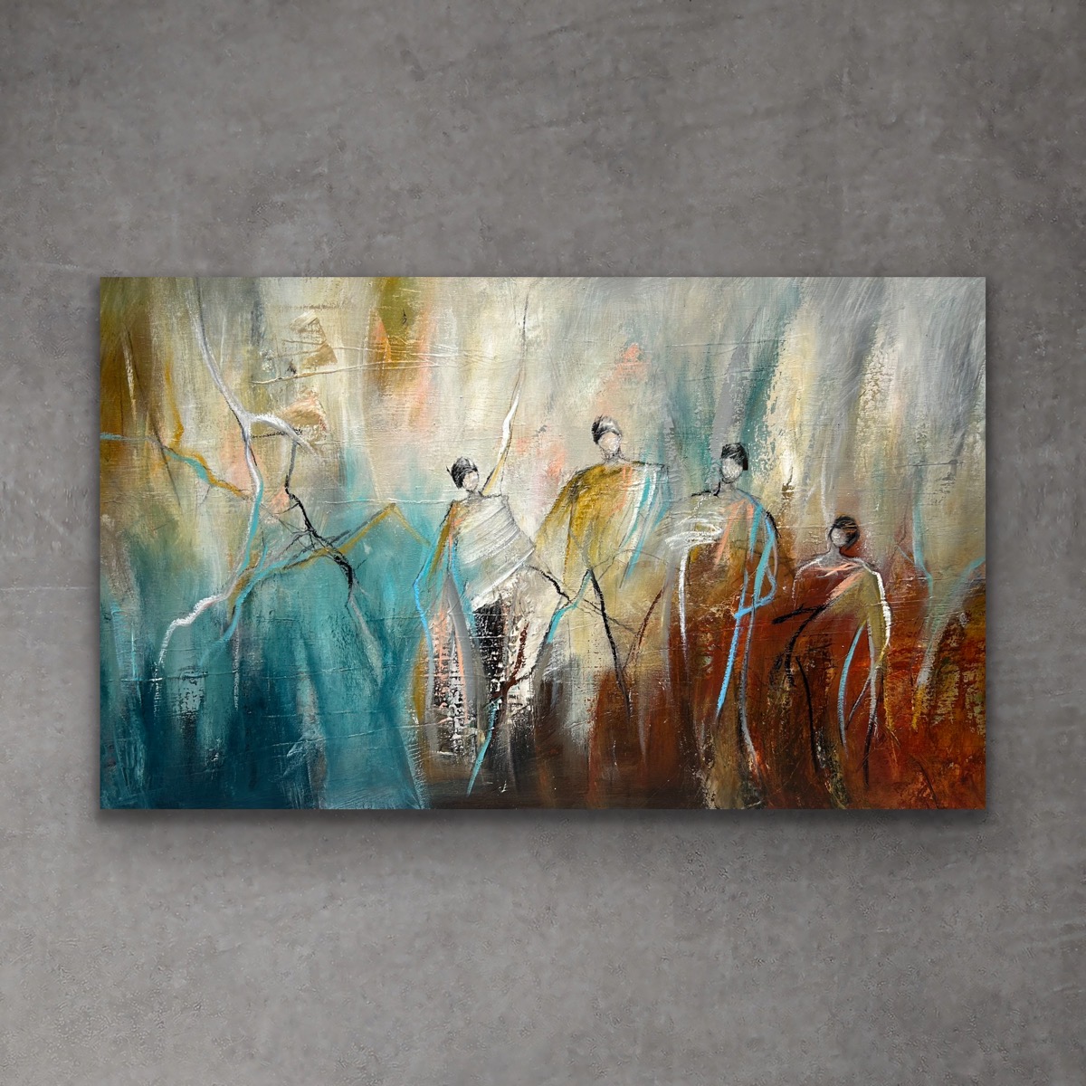 I min relationserie vil du altid møde to eller flere personer tone frem mere eller mindre tydeligt i en abstrakt baggrund eller sammenhæng. For mig er det især relationen imellem maleriets persongalleri, der er det primære.